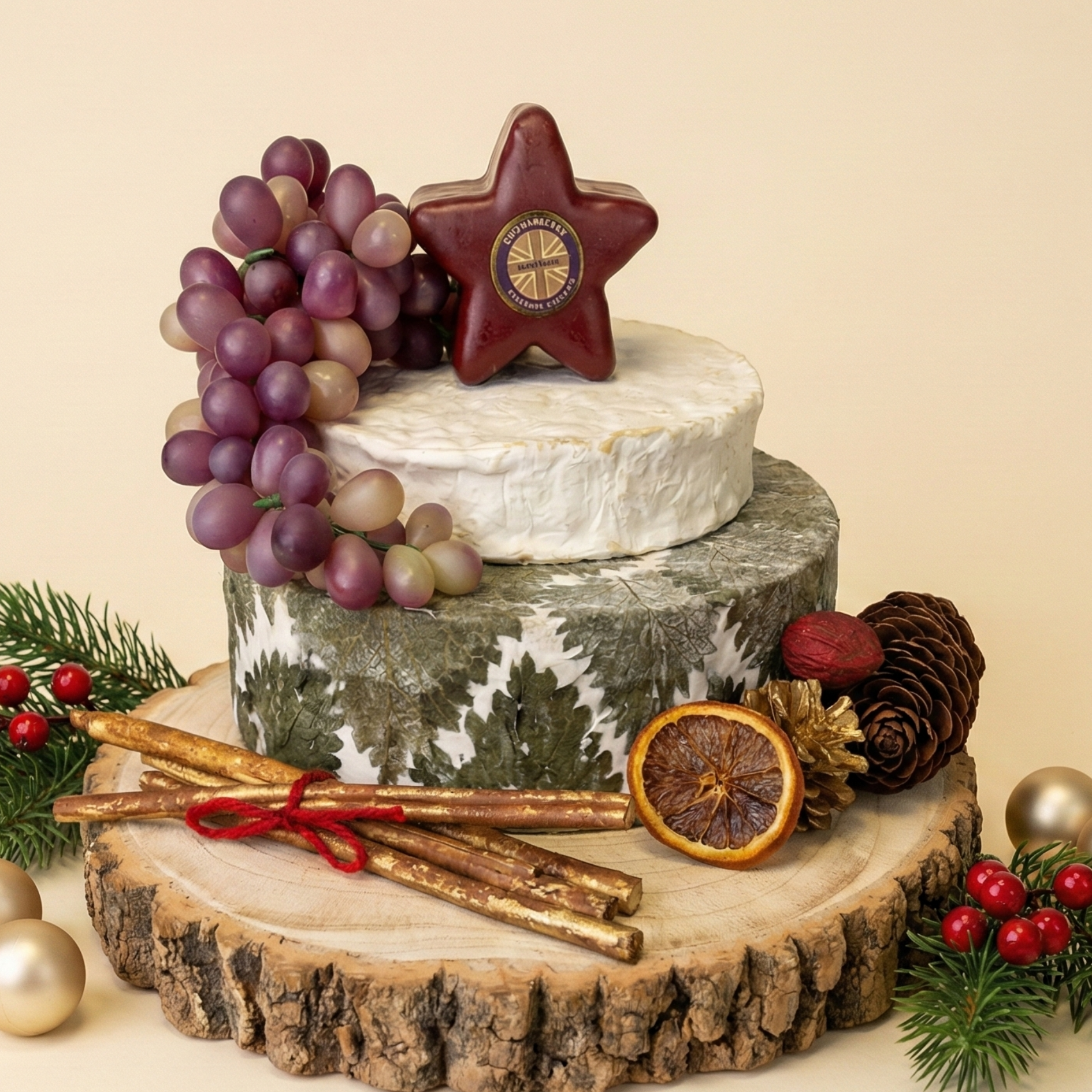 Christmas Special Cheese Cake Product Details: 1x Whole wheel Cornish Yarg. Approx 3.2 KG 1x Whole wheel Cornish Brie approx 1 KG 1x Godminster Organic Cheddar 200 gram Decoration and wooden base are not included and are for decorative purposes only. Have fun at home with your family and decorate it together