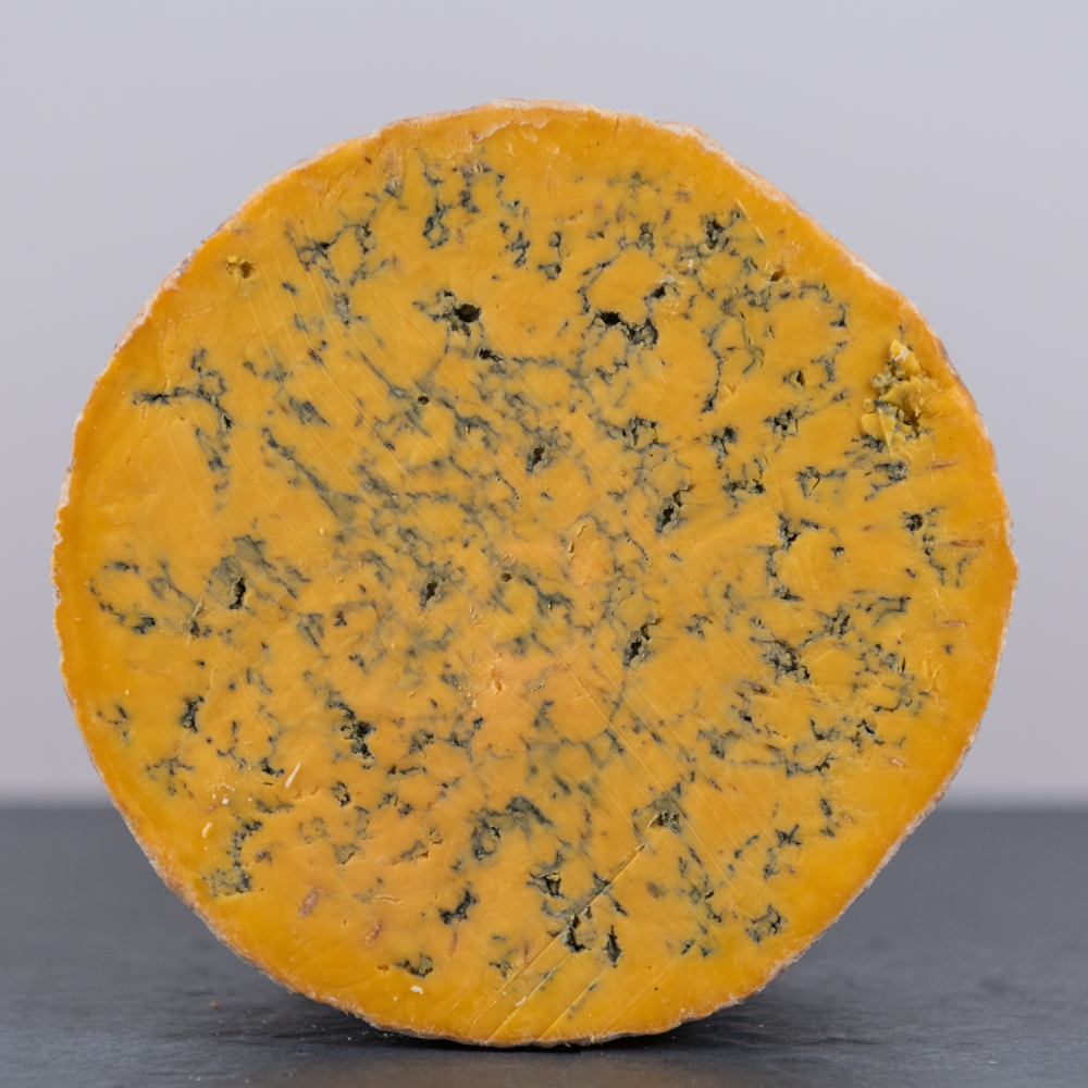 Shropshire Blue is a semi-firm blue cheese, described as a cross between Stilton and Cheshire. Over a period of 10-12 weeks, it develops an orange-brown natural rind and a smooth texture. With a sharp, strong flavour and tangy aroma, it is a vegetarian cheese with a fat content of 48%. It pairs well with Port Noir and Riesling.